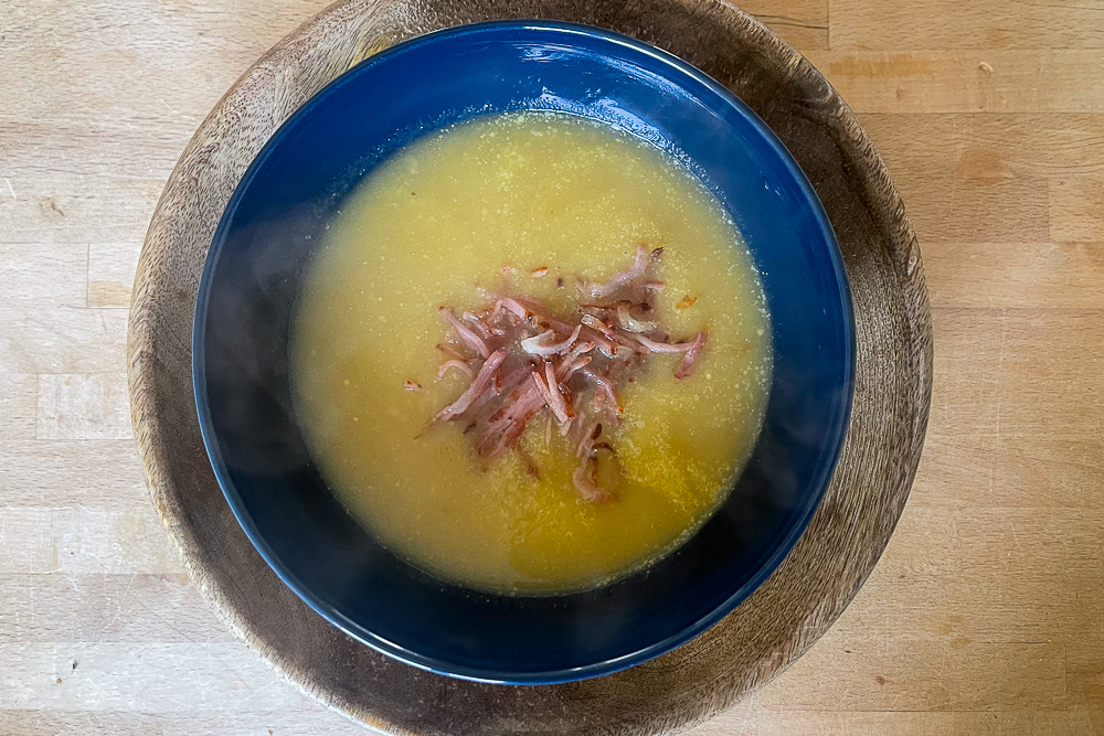 Mosterdsoep met gerookte spekreepjes. De super fijn gesneden spekreepjes die je in de soep ziet heb ik gekocht in een Duitse supermarkt.