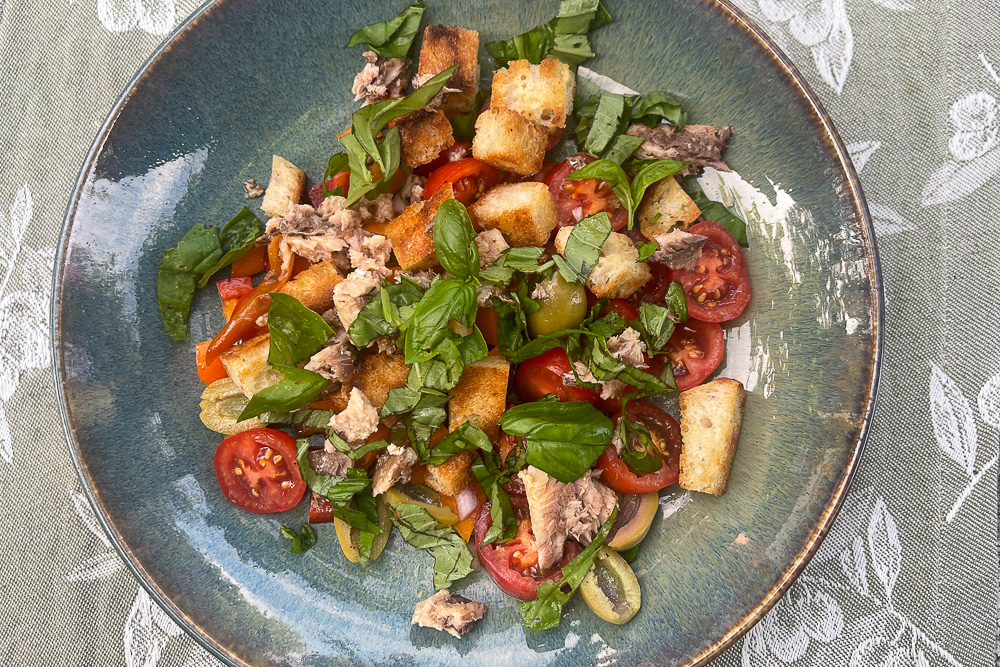 - In het origine recept wordt alles door elkaar gehusseld en dan wordt de dressing erover heen gedaan, wij houden van het knapperige brood.