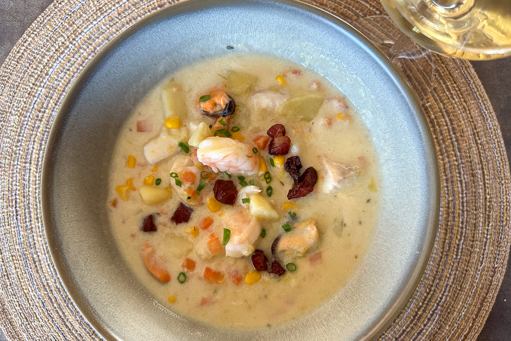 - Hak of knip de bieslook fijn. Schep de tijmtakjes uit de kookpan zodra de vis gaar is en doe weg. Serveer de chowder in kommen en garneer met de spekjes en bieslook. Bestrooi met wat peper.