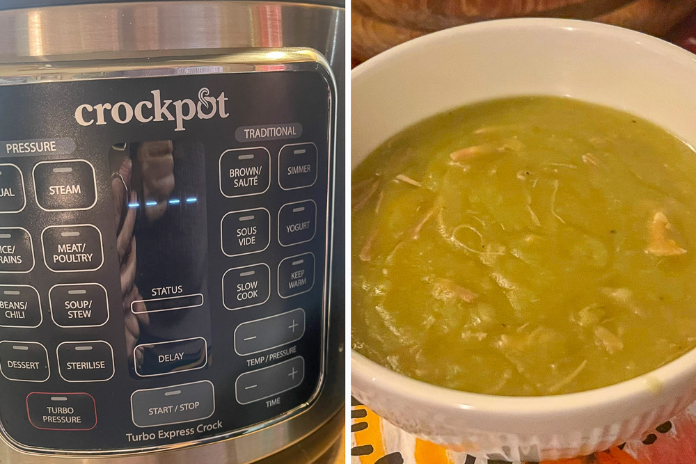 In de vakantie werden we uitgenodigd om te komen eten bij de buurvrouw van onze zoon en schoondochter. Dat werd een hernieuwde kennismaking met een hoge drukpan. Ooit in de begin jaren 80 heb ik er een gehad, ik kon er niet mee overweg. Katie heeft een elektrische en het vlees kwam er super mals uit. Thuisgekomen onszelf een ‘achteraf’ vakantie cadeautje gedaan. Even rustig aan beginnen, soep leek mij een mooie start. Binnen no-time was de soep klaar. We gaan nog veel plezier beleven aan onze Crockpot Pressure Cooker.