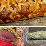 Haal de Beef Wellington uit de oven en laat nog 10 minuten onafgedekt rusten. Snij daarna in mooie plakken.