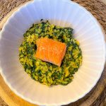 Schep de risotto in voorverwarmde kommen of borden en leg hier een stukje warm gerookte zalm op.
